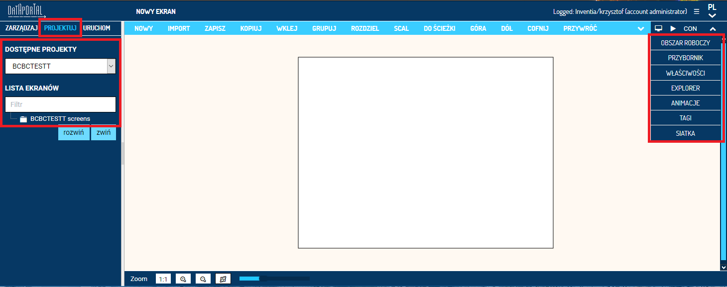 Wybierz projekt z menu DOSTĘPNE PROJEKTY, nad którym chcesz pracować. Poniżej znajduje się LISTA EKRANÓW, jakie znajdują się w wybranym projekcie. Wybierz EKRAN z listy aby otworzyć go do edycji w Designer.