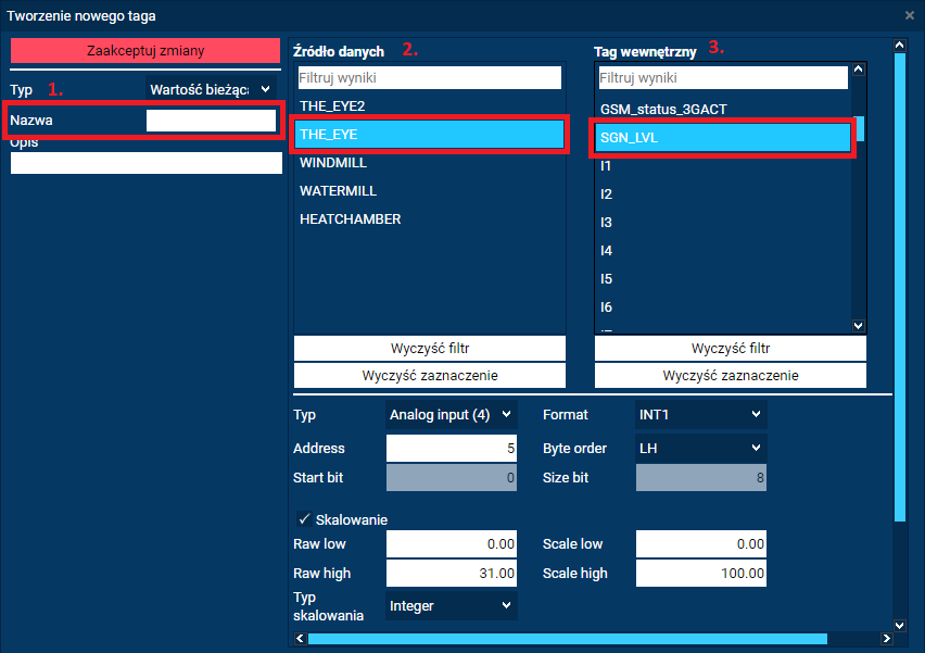 W oknie TWORZENIE NOWEGO TAGA wpisz nazwę, wybierz Źródło danych (jeśli nie ma należy utworzyć zgodnie z rozdziałem Tworzenie źródła danych) oraz żądany Tag wewnętrzny (predefiniowane zmienne w zależności od typu urządzenia, szczegółowy opis dostępny w mapie pamięci urządzenia). Kliknij ZAAKCEPTUJ ZMIANY.