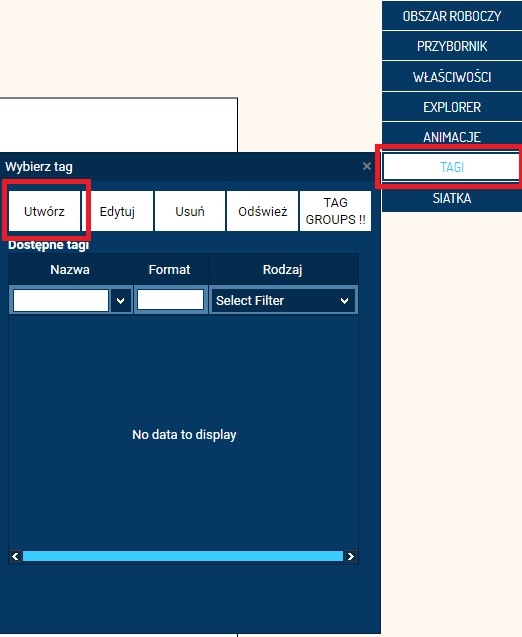 Naciśnij przycisk TAGi w menu paneli funkcyjnych, po czym naciśnij przycisk Utwórz.