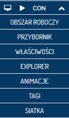Panel EXPLORER zawiera wszystkie elementy jakie zostały narysowane na ekranie. Właściwości narysowanego obiektu można edytować po ich zaznaczeniu z poziomu panelu WŁAŚCIWOŚCI natomiast animacje można dodawać w panelu ANIMACJE. Każda animacja wymaga danych wejściowych, które można kreować i edytować z poziomu panelu TAGI.